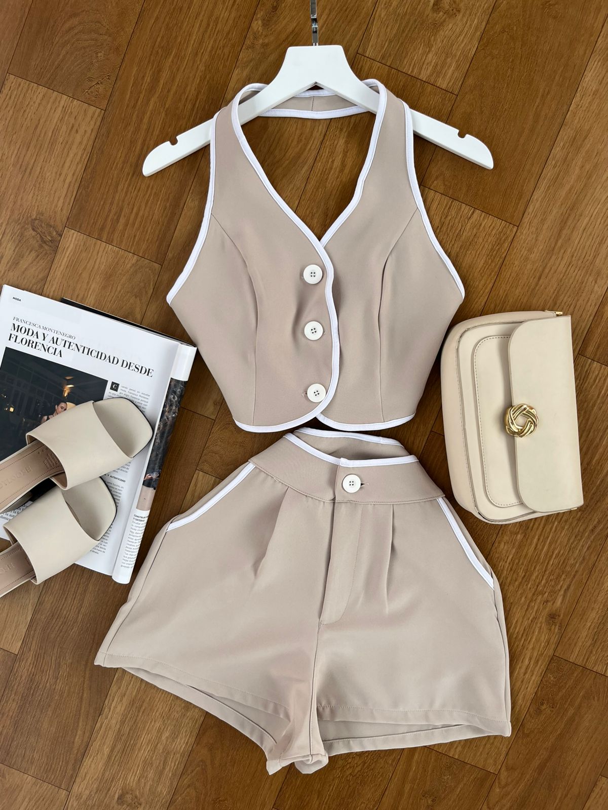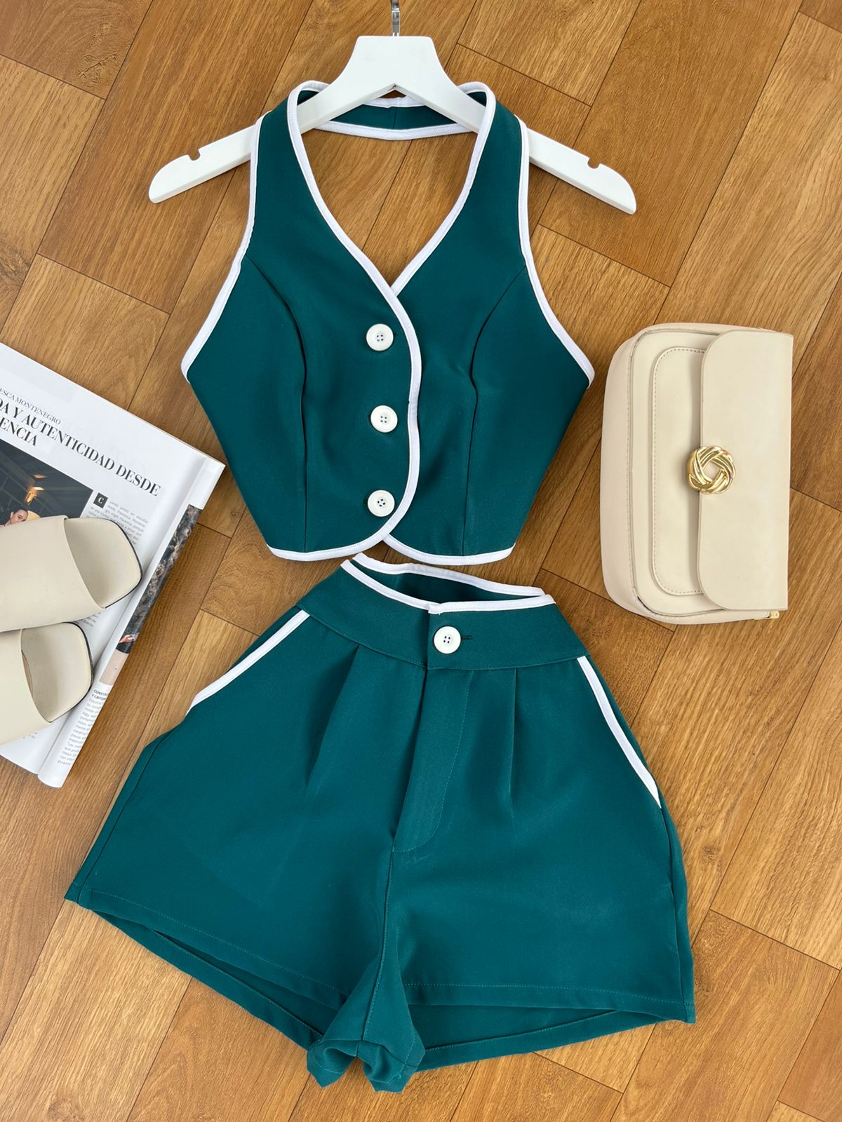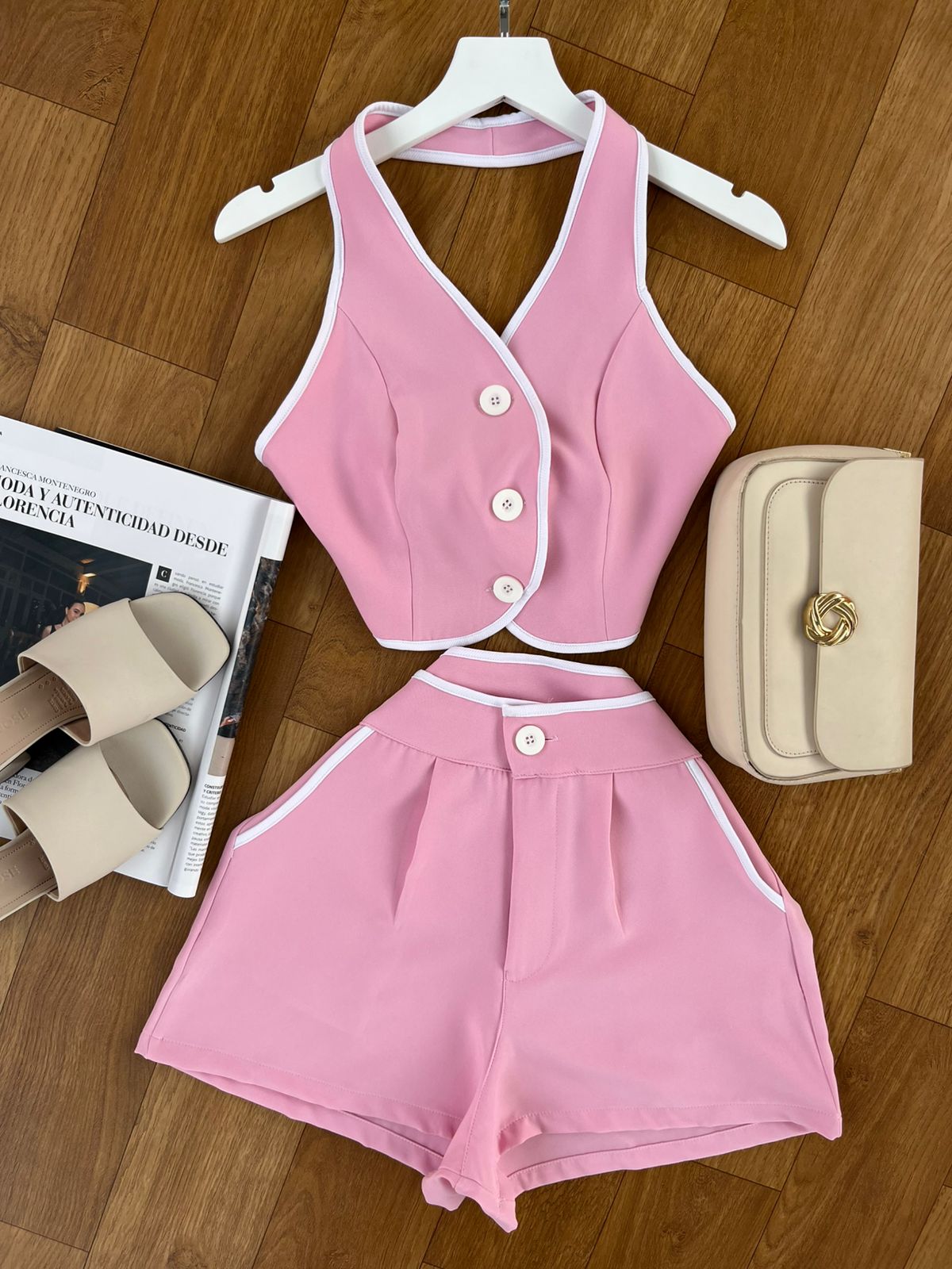 Short lleva bolsillo a los costados, pinzas la parte de atrás, top es ajustable la parte de atrás.