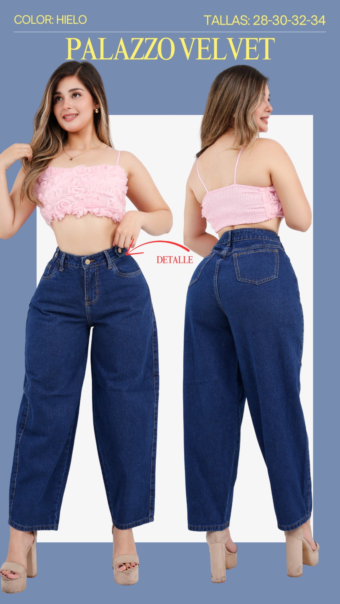 Estilo y Corte: Es un pantalón con el corte Palazzo, conocido por ser de tiro alto y tener una silueta amplia y fluida
